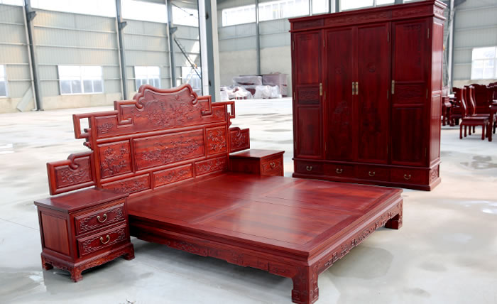 江蘇中尊木業有限公司臥室系列產品:佛光普照大佛龕,臥房四件套富貴大床、富貴大床床邊柜、四門衣柜等。